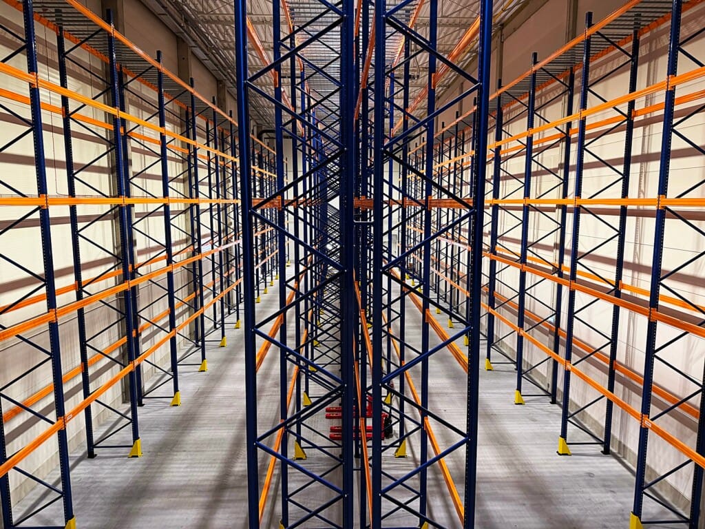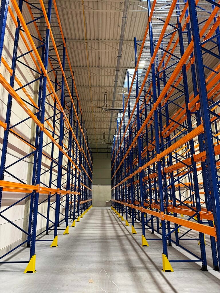 Fotografie wnętrza hali, wykonane już po umieszczeniu na miejscu regałów przez najemcę, stanowią najlepsze uzupełnienie tej historii. Pokazują one, jak przestrzeń SBU może funkcjonować w rzeczywistości — z regałami, towarem i gotową infrastrukturą logistyczną.