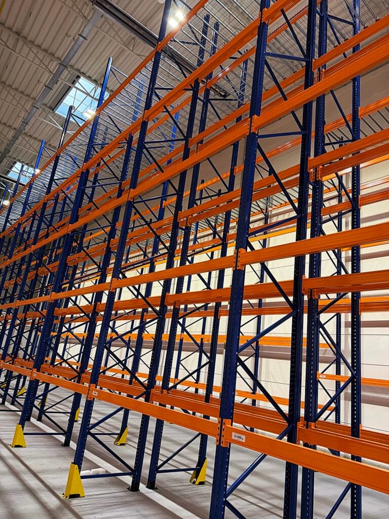Po wejściu do hali uwagę zwracały zainstalowane regały magazynowe, zajmujące znaczną część dostępnej powierzchni. Nie była to pusta, surowa przestrzeń, lecz aktywnie użytkowany magazyn, z czytelnym układem składowania i logicznie zaplanowanymi ciągami komunikacyjnymi.